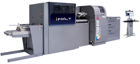 - Το MGI Meteor Unlimited Colors Se+, ψηφιακό πιεστήριο για in-line εκτύπωση και χρυσοτυπία χωρίς κλισέ, σε σχήμα 33x65cm.